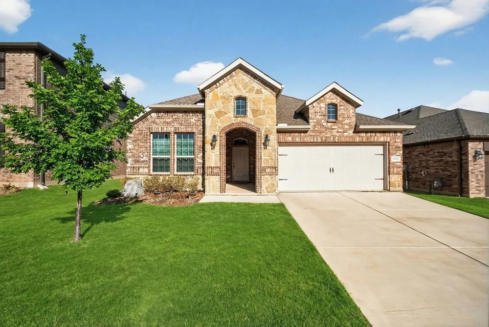 This immaculate, newly built one-level home in the desirable Silverado community offers a perfect blend of modern luxury and functional design within the top-rated Aubrey ISD. The bright and open-concept interior features durable luxury vinyl plank flooring throughout the main living areas, centered around a spacious living room with an elegant electric fireplace that flows seamlessly into the kitchen. This kitchen features a large granite island, breakfast bar, and stainless steel appliances, with the added convenience of a refrigerator, washer, and dryer all included in the rental. The thoughtful layout provides privacy by splitting the secondary bedrooms from the primary suite, which serves as a true retreat with its garden tub, separate shower, and generous walk-in closet. Outside, you can enjoy a private fenced backyard and covered patio, while the community itself offers resort-style amenities including a pool, jogging trails, playgrounds, and pickleball courts, all with an on-site elementary school within walking distance. Positioned for easy access to FM 720 and I-35. Life here moves at your speed—tranquil and charming at home, yet conveniently close to the action.