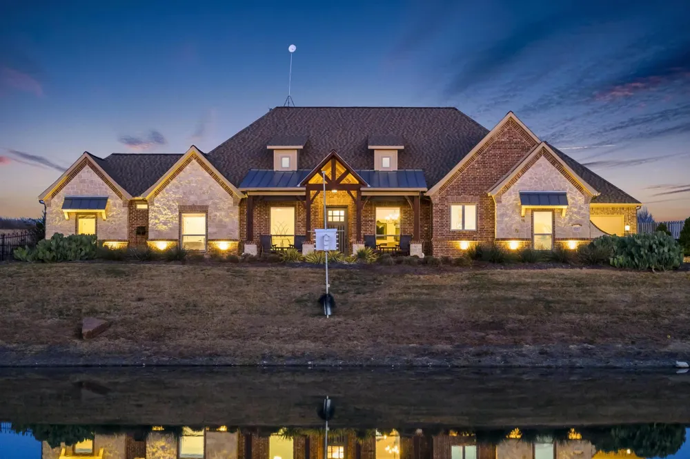 Nestled on nearly two acres in Northwest ISD, this custom designed and custom built 4-bedroom, 3-bath home offers over 3,500 square feet of thoughtfully designed living space paired with resort-style outdoor amenities. From the moment you arrive, the stone wall and expansive front porch with retractable screens set the tone for refined Texas living. Inside, cathedral ceilings and an open-concept layout create a seamless flow, anchored by a chef-inspired kitchen featuring an impressive 11’6” built-in dining table, LED lighting throughout, and a whole-house water filtration system with reverse osmosis. The private theatre room is fully equipped with surround sound and a three-TV setup, perfect for immersive entertainment. Step outside to a backyard designed for both relaxation and hosting. Enjoy an 18x36 chlorine pool with beach entry, stamped concrete patios, built-in outdoor kitchen, fire pit, and multiple outdoor TV setups with integrated speakers. This home offers drainage improvements and pond enhancements to ensure beauty and functionality, with a stocked fishing pond as the centerpiece. The professionally landscaped grounds include 36 watering zones supporting 150 mature native trees and 200 native perennials, attracting hummingbirds and butterflies year-round. Additional highlights include fresh exterior paint in 2024, a roof replaced in 2019, a new water heater in 2021, an additional electric panel for future lighting enhancements, and expansive front and back porches designed for outdoor living. This one-of-a-kind Newark property offers privacy, luxury, and unmatched outdoor living—an exceptional opportunity.