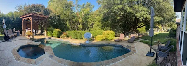 Wonderfully versatile American classic home in a tranquil setting with sparkling pool, spa and arbor on a treed creek lot! Living room features brick fireplace, built-in entertainment center and wall of windows with view of pool and tree-lined creek and remote blinds. Beautiful hardwood floors. Formal dining being used as sitting area-bar room and 5th bedroom could be an office or study. Gourmet kitchen with granite countertops, gas cook top, decorative shelving and opens to brick-accented sunroom with loads of natural light. Small neighborhood with a beautiful park. Walking-jogging paths in neighborhood and tennis courts. Very desired neighborhood in McKinney. Don't delay!
