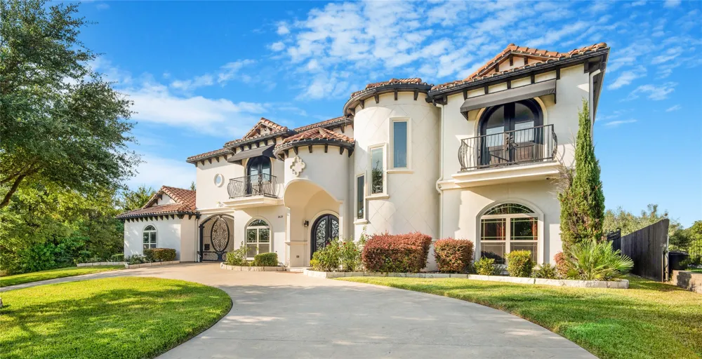 Step into timeless sophistication with this stunning 5-bedroom, 4-bath Spanish-style estate, where classic design meets everyday functionality. From the moment you arrive, the turret staircase and graceful port cochere set the tone for a home that’s both dramatic and inviting. Inside, arched windows and wrought iron accents frame sunlit living spaces, while the layout offers room to gather, retreat, and entertain with ease. The spacious kitchen and living areas offer easy access to the large, paved deck leading to the backyard, perfect for hosting. While the private bedrooms, including a luxurious primary suite with an attached 14x14 custom closet, offer comfort and privacy for all. Imagine yourself enjoying the morning breeze on your upstairs balcony which offers stunning and relaxing views of Joe Pool Lake. Outside, the circular driveway welcomes guests in style, and the extra rear parking ensures convenience for multiple vehicles. Nestled in a lush, tree-lined neighborhood, this property combines curb appeal with practicality, ideal for families, entertainers, or anyone seeking a home with grandeur that is sure to turn heads.