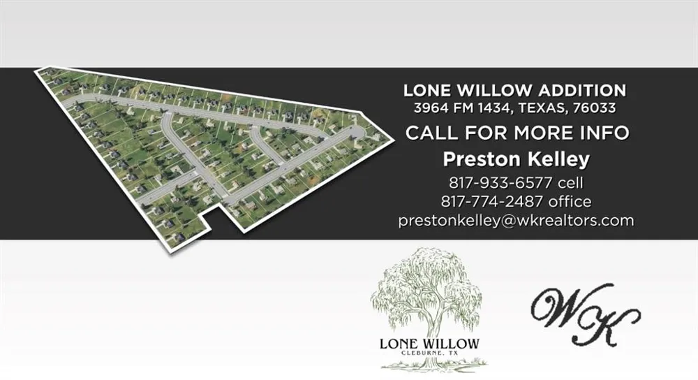 Welcome to Lone Willow Addition - Your Perfect Escape Near Cleburne Lake! Nestled on the picturesque west side of Cleburne Lake, Lone Willow offers the perfect blend of peaceful country living with easy access to city conveniences. Located just six miles from Cleburne and only ten miles from the Chisholm Trail Toll Road, this prime development provides quick connections to Highway 67, making your commute a breeze! Situated outside city limits yet within Cleburne's Extraterritorial Jurisdiction (ETJ), Lone Willow gives you the flexibility of rural living with the potential for future growth. Each homesite in Phase 1 has already been equipped with water taps by Johnson County Special Utility District (JCSUD), ensuring a seamless connection to start to your dream home build. For modern conveniences, United Cooperative Services is powering this development with electric service as well as fiber-optic high-speed internet, keeping you connected while enjoying the beauty of the Texas countryside. Whether you're looking to build your forever home or invest in a growing community, Lone Willow is the perfect place to put down roots. Don't miss out on this incredible opportunity! Contact us today for more details and to secure your spot in this stunning new development! The seller's are willing to offer concessions to assist with the buyer's closing cost and or buying the interest rate down, making this an excellent opportunity to secure your dream home with added financial flexibility.