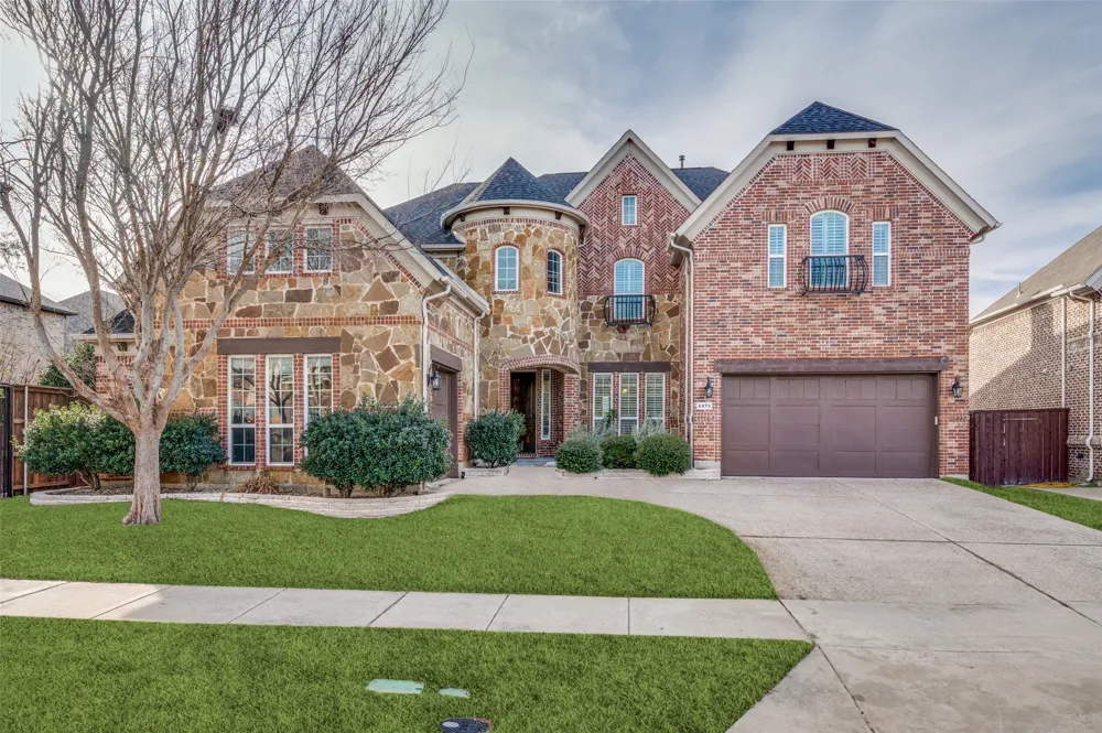 Stunning east-facing Frisco residence offering 5 bedrooms and 4.5 baths, ideally situated in a coveted location served by award-winning Frisco ISD. From the moment you enter, the home captivates with graceful architectural lines, curved walls, and a dramatic foyer anchored by an elegant sweeping staircase. Natural light pours into the expansive living area, where soaring ceilings, a striking fireplace, and an impressive wall of windows create a truly grand atmosphere. Designed for both refined entertaining and everyday living, the formal dining space and open-concept kitchen shine with a generous island, seating area, stainless steel appliances, statement lighting, and plentiful cabinetry. A versatile northeast-facing flex room offers endless possibilities to suit your lifestyle. The private downstairs primary retreat features a spa-inspired ensuite with dual sinks, separate vanities, a soaking tub, walk-in shower, and a spacious closet. A secondary bedroom with a full bath on the main level is ideal for guests or multigenerational living. Upstairs, enjoy a thoughtfully planned layout with a junior primary suite, additional well-sized bedrooms, a large family room, game room, and a dedicated media room perfect for entertaining. Notable upgrades include extensive hardwood flooring, plantation shutters, a new AC unit (2024), new roof (2021), and fresh interior paint (2025). The owned 19.6 kWh solar system installed in 2021 provides exceptional energy efficiency. Step outside to a sprawling 700+ sq ft extended concrete patio, perfect for hosting, relaxing, or play. Nestled in a peaceful, welcoming neighborhood close to parks, shopping, and dining, this impeccably cared-for home blends sophistication, comfort, and smart living—ready to impress and ready to welcome its next owners.